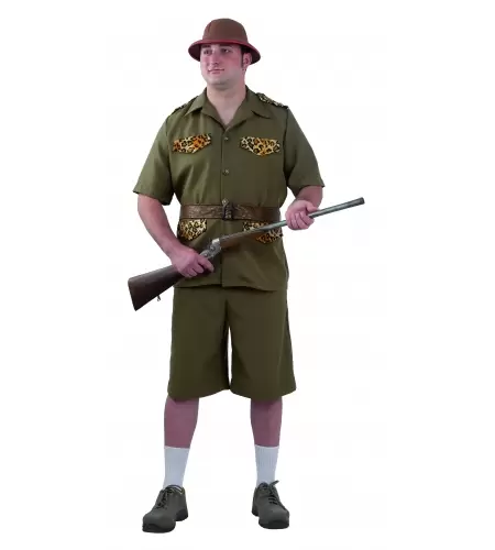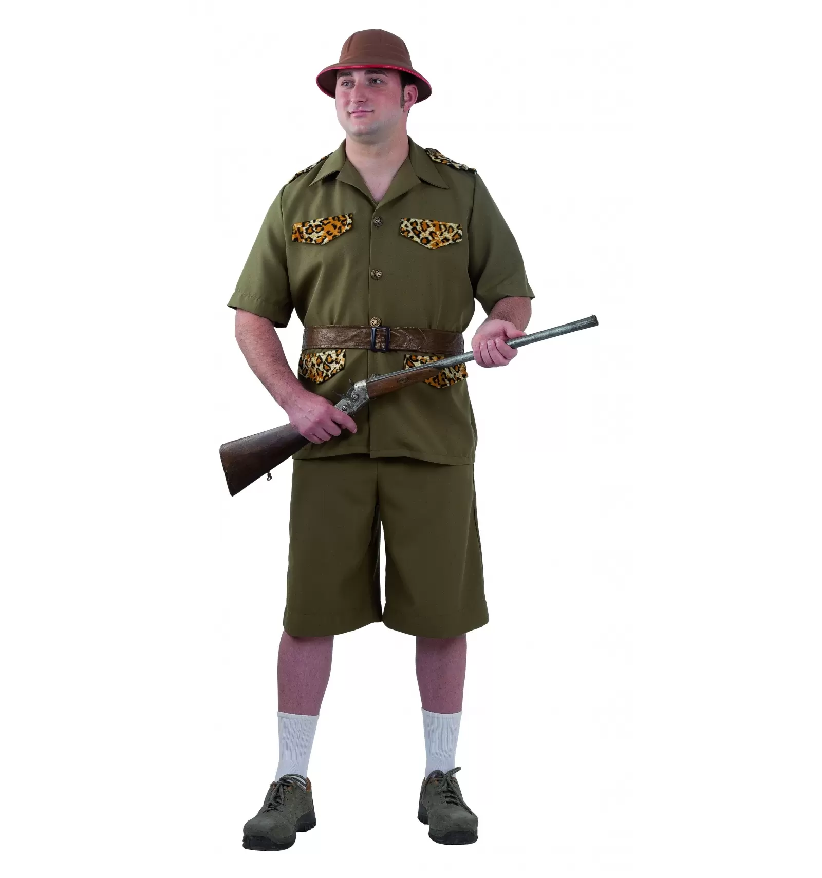 Déguisement de chasseur en safari disponible en 48 et 52, et qui comprend la chemise, le pantalon et la ceinture.
