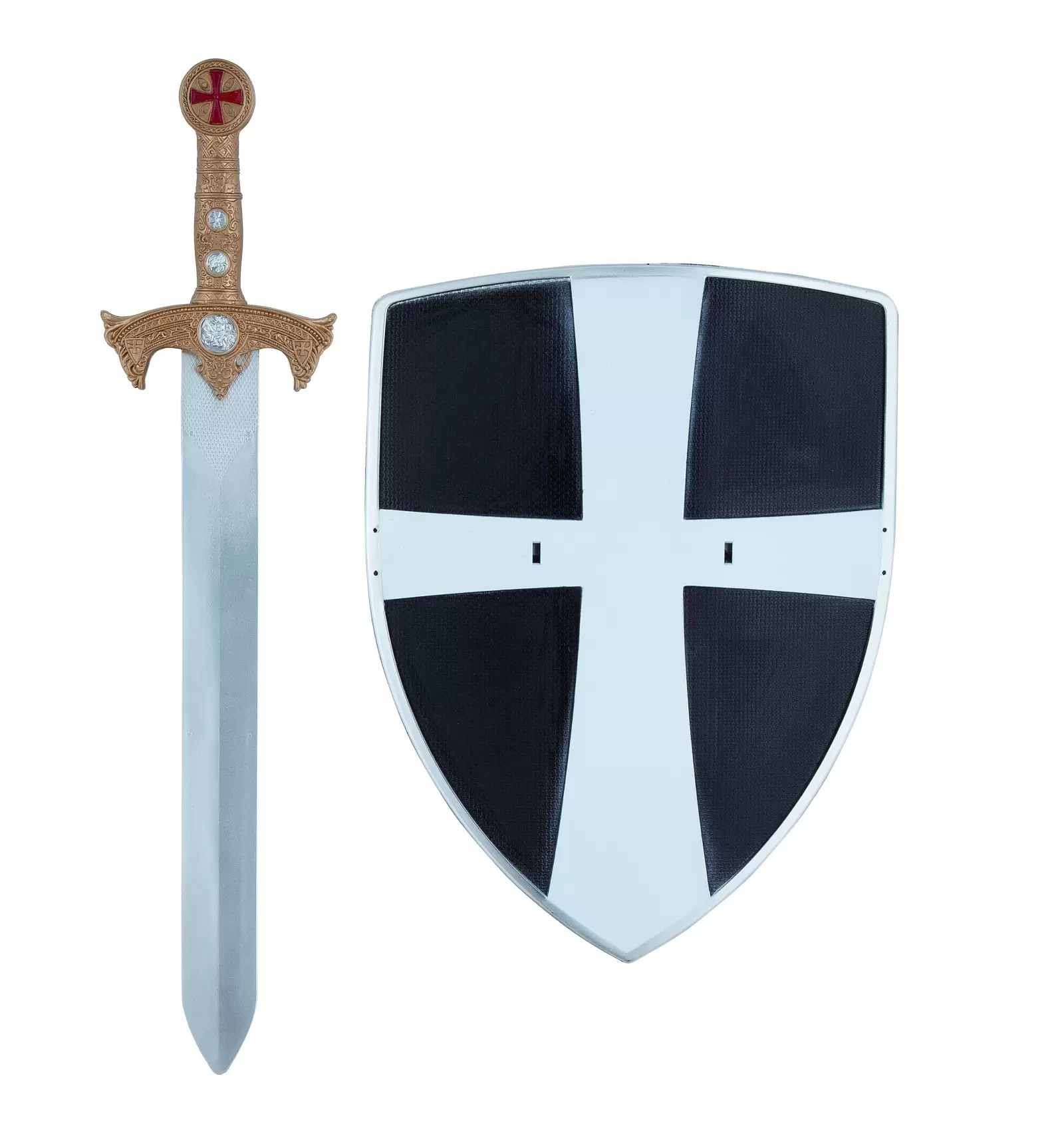 Épée et bouclier médiéval fabriqué en plastique résistant avec les mesures : épée de 58 cm et bouclier de 41 x 31 cm.