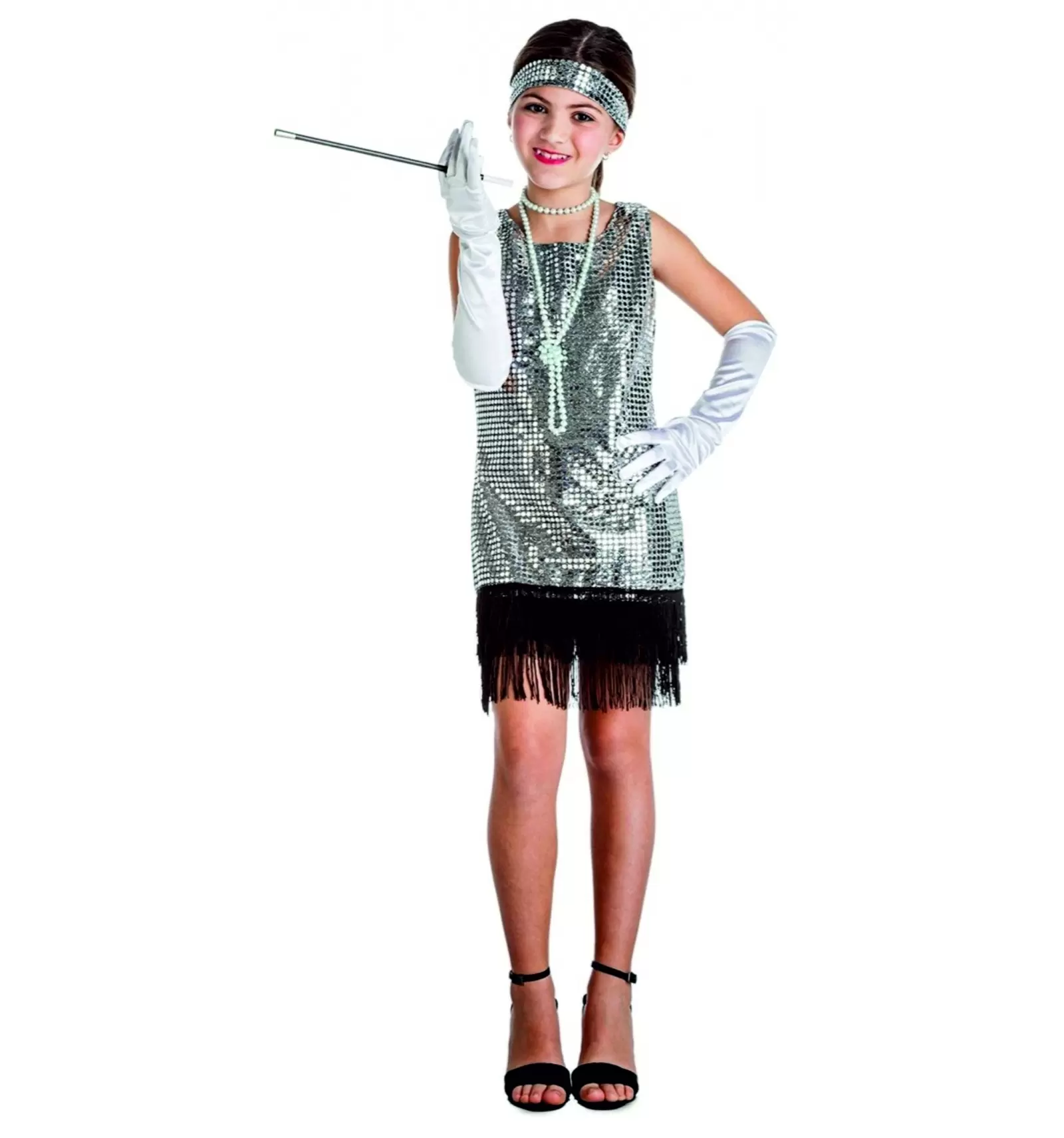 Déguisement de charleston à paillettes, disponible en plusieurs tailles, et qui comprend : la robe et le ruban pour les cheveux.