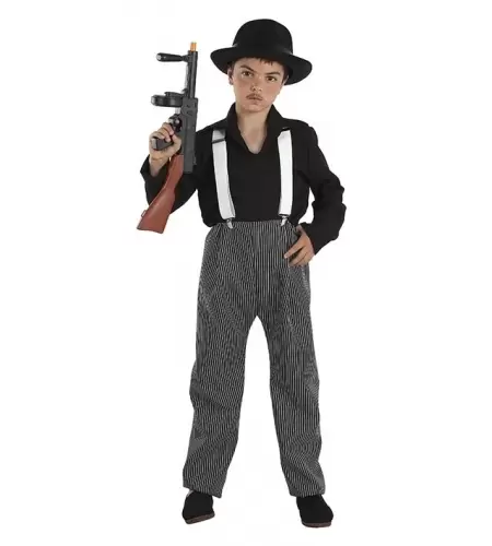 Déguisement de gangster pour garçons disponible en 6, 8 et 12 ans, et qui comprend la chemise, le pantalon et les bretelles.