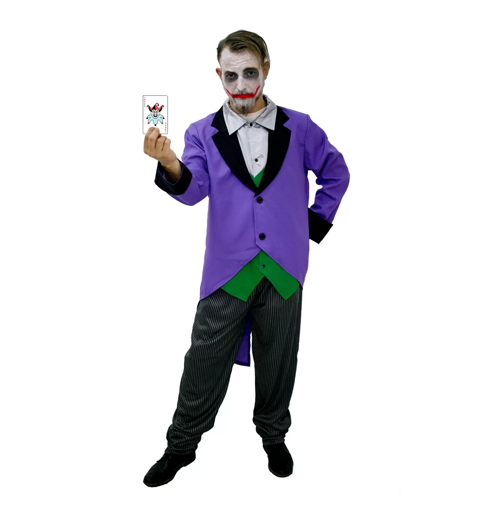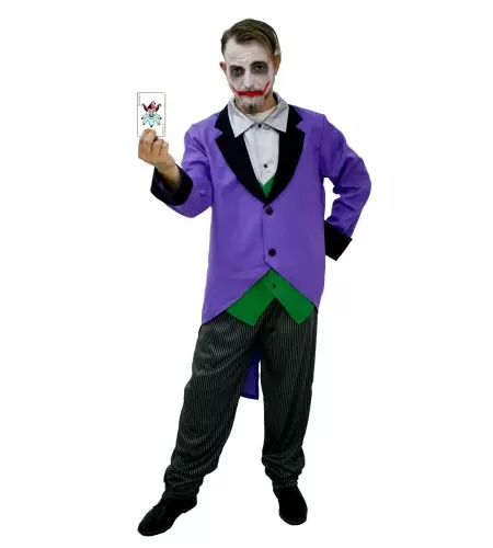 Déguisement de joker pour adultes, disponible en plusieurs tailles. Comprend le pantalon et la veste avec le gilet et la chemise (une seule pièce).