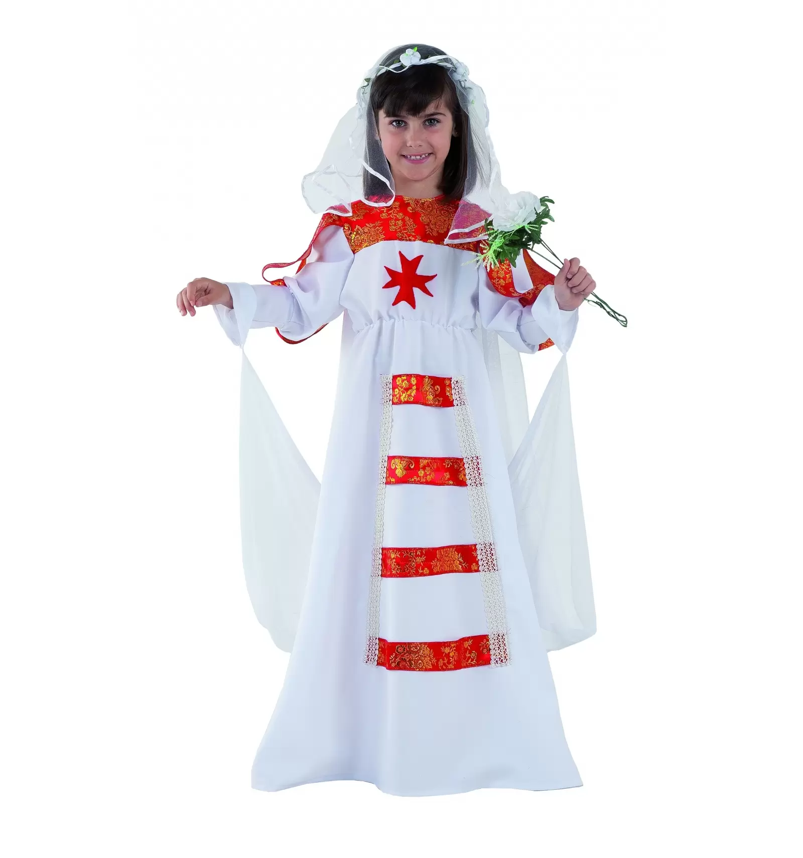 Déguisement de fiancée médiévale disponible en 4, 6, 8 et 12 ans, et qui comprend la robe et la cape.