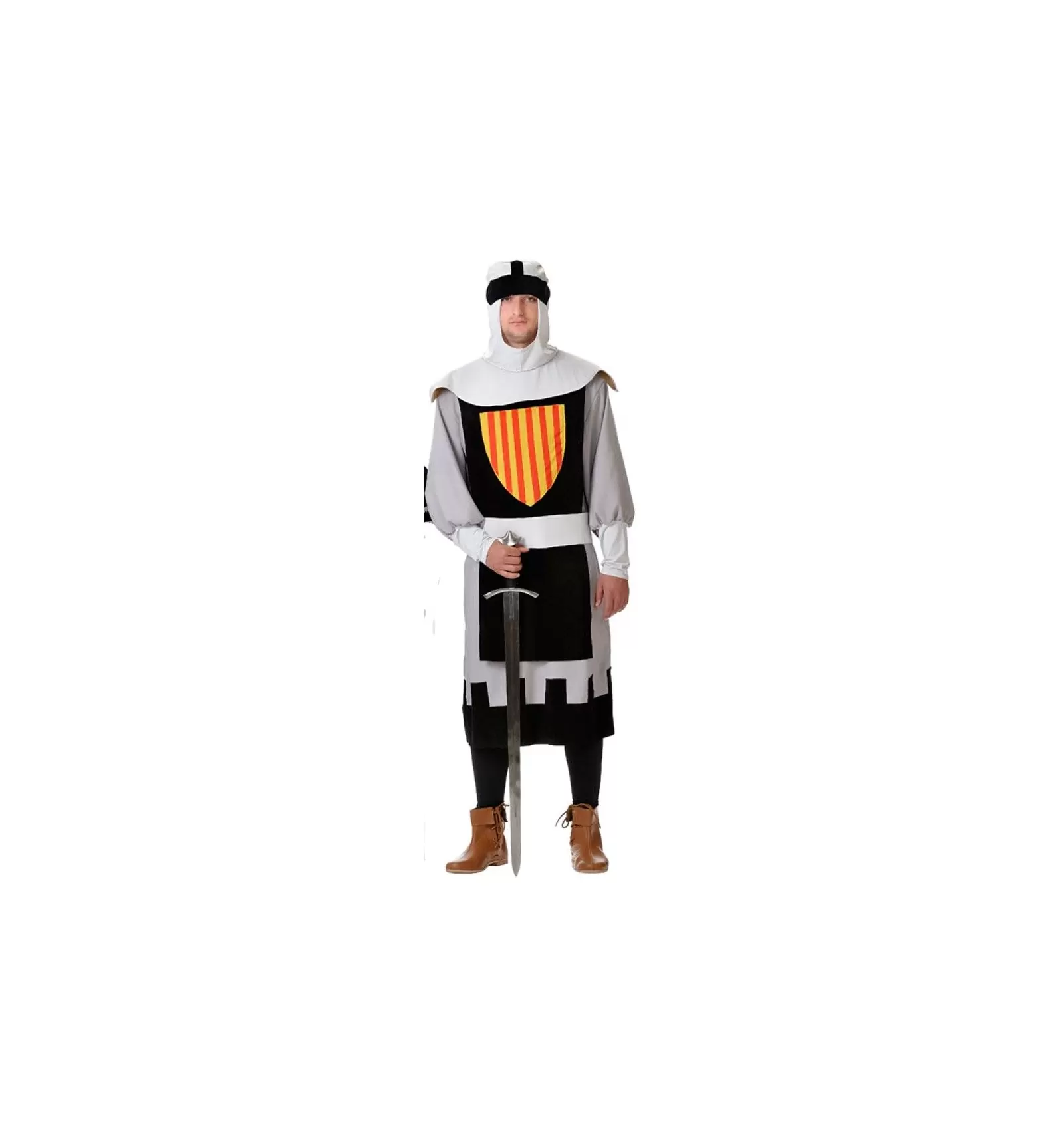LE DÉGUISEMENT DE GUERRIER MÉDIÉVAL COMPREND LA CAPUCHE, LA TUNIQUE, LE PANTALON, LA CEINTURE, LA CASAQUE ET LA COLLERETTE.