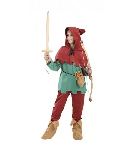 Déguisement Robin des bois disponible en 4, 6, 8 et 12 ans, et qui comprend la capuche, la chemise, le pantalon, les bottes et la sacoche.