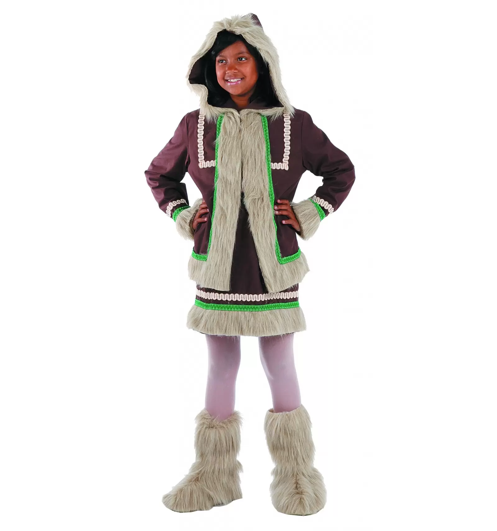 Déguisement d"esquimau fille fabriqué en tailles 6, 8 e 12 ans. Il comprend la veste avec capuche, la jupe et les sur-bottes.