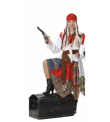 LE DÉGUISEMENT DE PIRATE EXISTE EN TAILLE 38, 42 ET 48 ET COMPREND LE BANDANA AVEC RASTA, LE GILET, LA CHEMISE, LA CEINTURE ET LA JUPE.