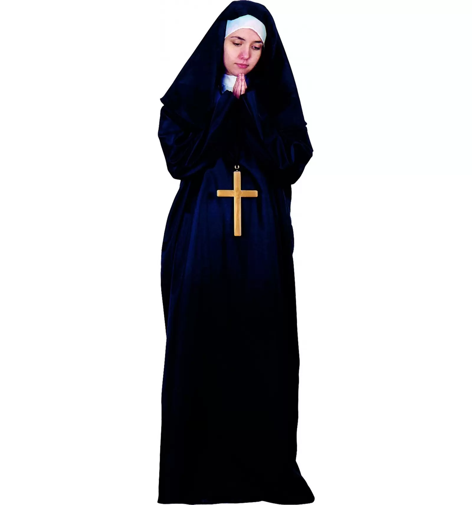 LE DÉGUISEMENT DE NONNE OU BONNE SOEUR EXISTE EN TAILLE 44 ET COMPREND LA COIFFE, LA COLLERETTE ET LA TUNIQUE.