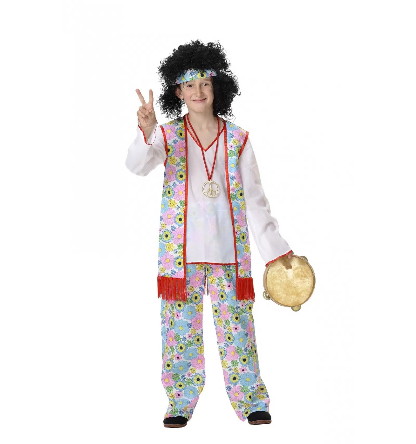 O COSTUME HIPPIE TAMANHOS SÃO FÁBRICA EM 6 A 10 ANOS E INCLUI, COLETES COM FRANJAS, PARTES INFERIORES DE SINO, CAMISA E TAPE.