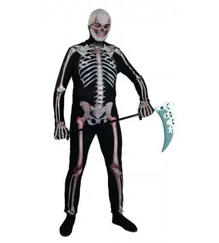 Fato esqueleto ou caveira. Inclui macacão, máscara e luvas. Disponível em tamanho 52.