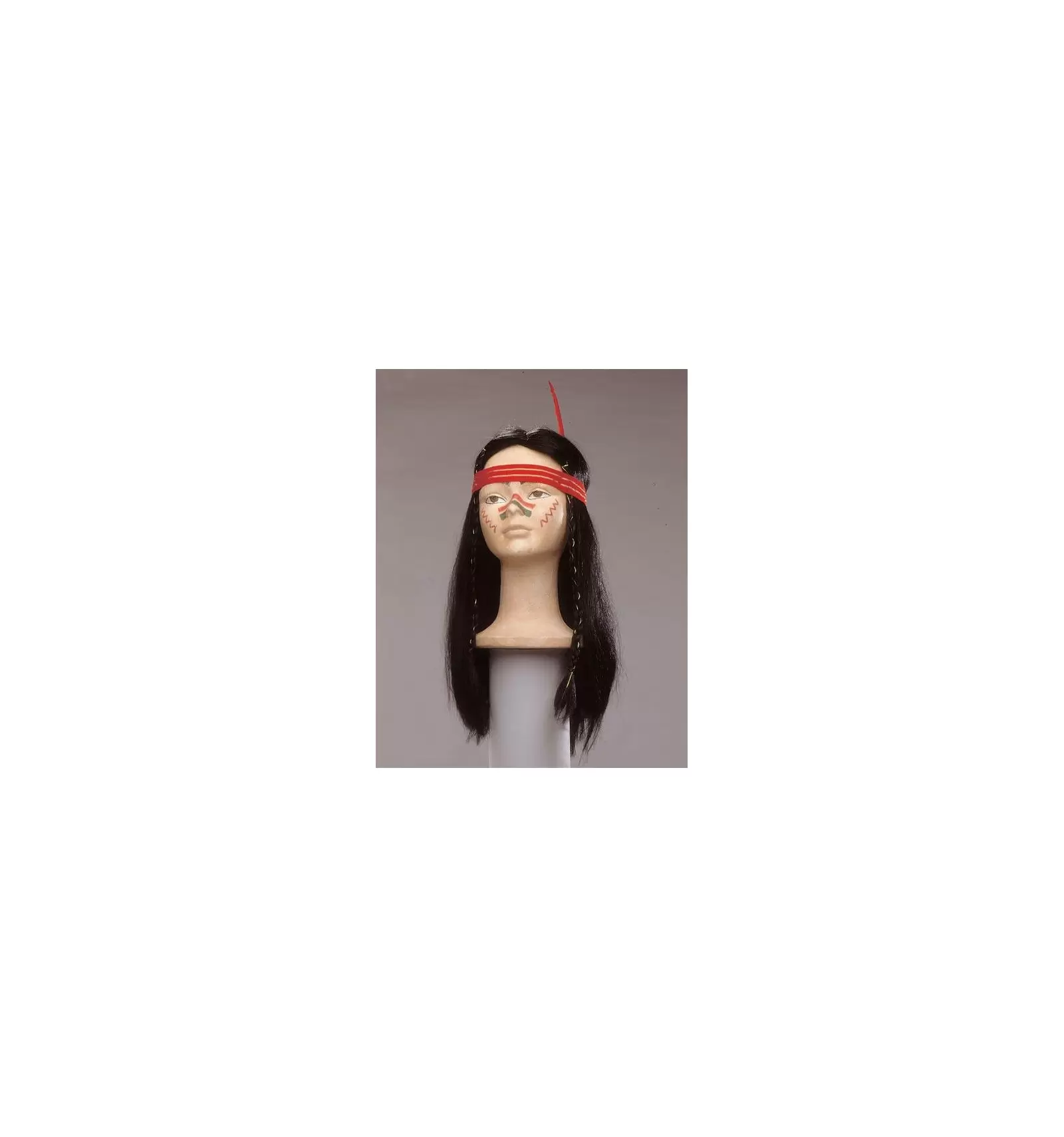 Peruca índio com juba longa e preta. Inclui fita com pena. Em cabelo sintético.